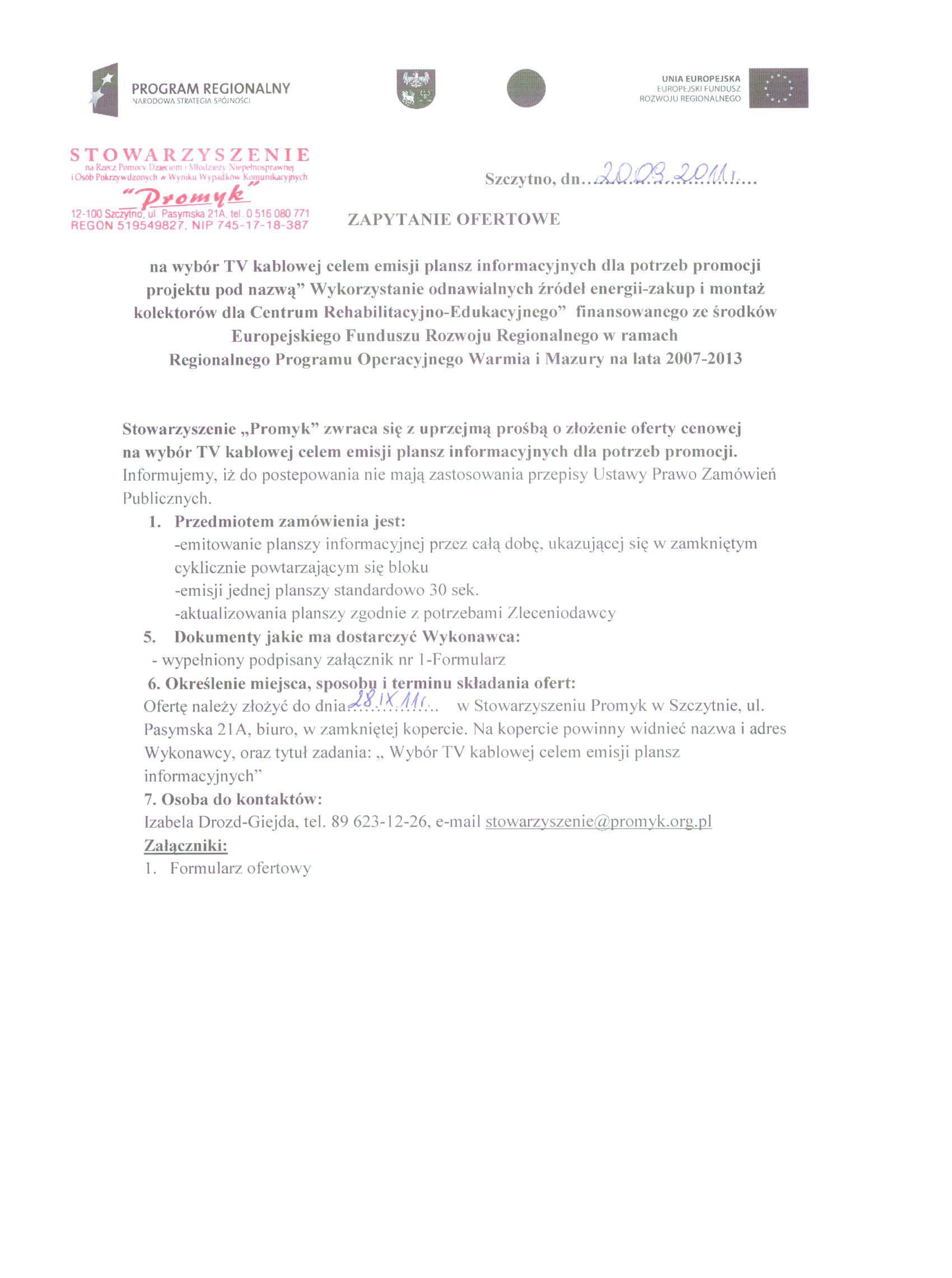 na wybr TV kablowej celem emisji plansz informacyjnych dla potrzeb promocji